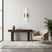 The Sarah Wall Lamp brings natural alabaster stone and metal craftsmanship to your bedroom, hallway, or living room. Its elongated vertical shape casts a warm glow upward and downward, creating ambient lighting without taking up surface space. Available in two heights with black, brass, or copper finishes, it works as a bedside reading light or an accent piece in narrow spaces.