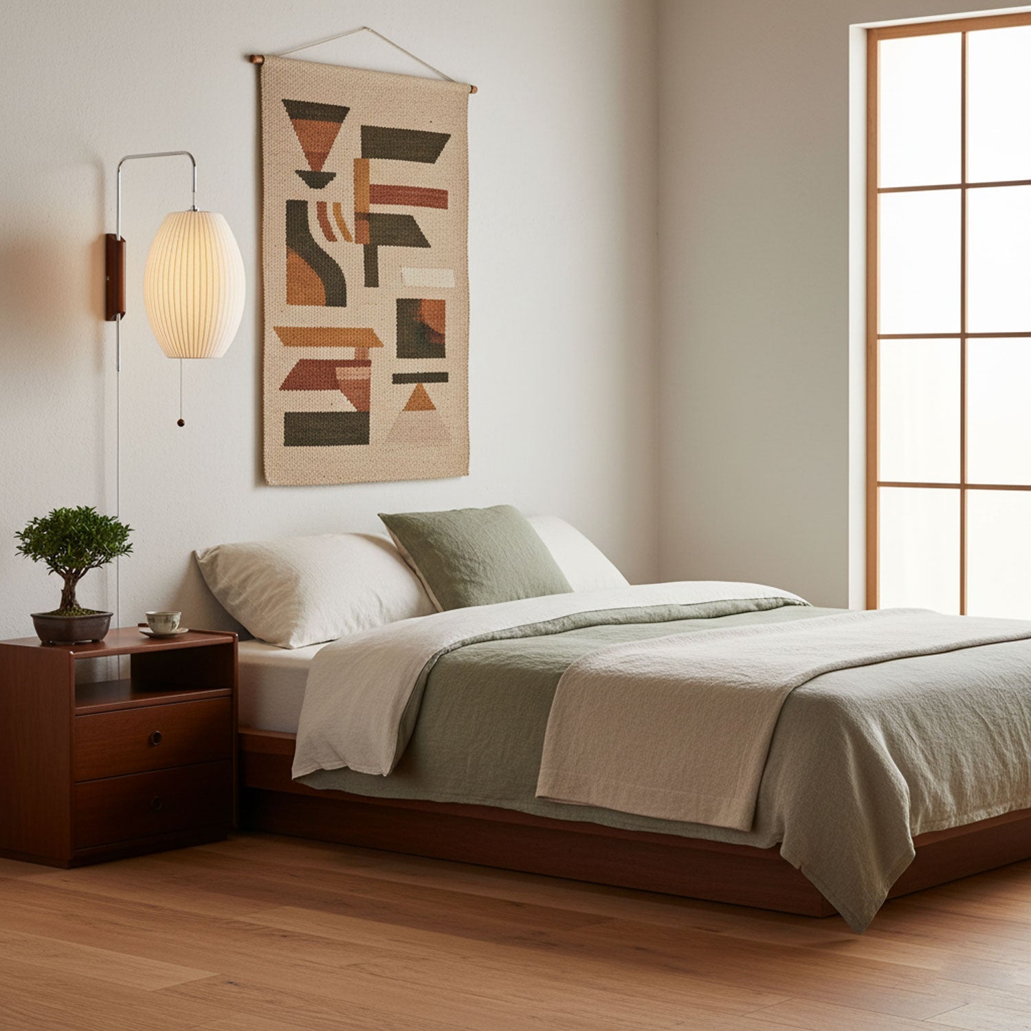 Ambient wall lighting – The paper shade helps distribute light evenly, creating a relaxed mood for bedrooms and living spaces.